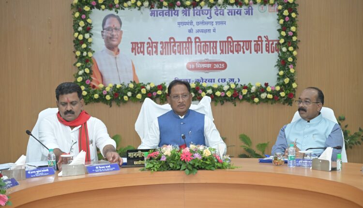 मुख्यमंत्री श्री विष्णुदेव साय की अध्यक्षता में आज कोरबा कलेक्ट्रेट सभाकक्ष में मध्य क्षेत्र आदिवासी विकास प्राधिकरण की बैठक आयोजित हुई। मुख्यमंत्री श्री साय ने कहा कि मध्य क्षेत्र आदिवासी विकास प्राधिकरण के पुनर्गठन के बाद आज की यह प्रथम बैठक एक नए संकल्प और दृष्टिकोण के साथ आयोजित हो रही है। उन्होंने कहा कि आदिवासी समुदाय के कल्याण और समग्र विकास के लिए सरकार सभी ठोस कदम उठा रही है। विकास कार्यों के लिए संसाधनों की कोई कमी नहीं होगी।