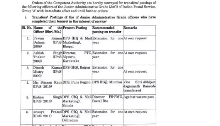इसके अलावा, दो अन्य निदेशकों को भी एक्सटेंशन दिया गया है, जिनमें पवन डालमिया निदेशक भोपाल सर्किल और पोस्टल ट्रेनिंग सेंटर मैसूर के निदेशक आशीष सिंह शामिल हैं । आशीष सिंह बिलासपुर के मूल निवासी हैं । देश भर के 19 सर्किल के निदेशकों के तबादले भी किए गए हैं ।