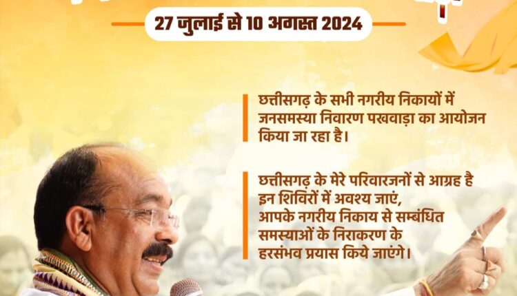 राज्य के सभी नगरीय निकायों में आज से जनसमस्या निवारण पखवाड़ा प्रारंभ हो गया है। उप मुख्यमंत्री तथा नगरीय प्रशासन एवं विकास मंत्री श्री अरुण साव ने सभी नगर निगमों के आयुक्तों और विभाग के पांचों क्षेत्रीय कार्यालयों के संयुक्त संचालकों से फोन पर बात कर गंभीरता से नागरिकों की समस्याएं निराकृत करने के निर्देश दिए हैं। उन्होंने जनसमस्या निवारण पखवाड़ा के दौरान वार्डवार आयोजित शिविरों में आधार कार्ड, राशन कार्ड, जन्म-मृत्यु प्रमाण पत्र, भवन निर्माण अनुज्ञप्तियां, नल कलेक्शन, राष्ट्रीय परिवार सहायता, वृद्धावस्था पेंशन, सामाजिक सुरक्षा पेंशन, अनापत्ति प्रमाण पत्र जारी करने तथा नामांतरण व स्वरोजगार के प्रकरणों का निपटारा करने भी कहा है।