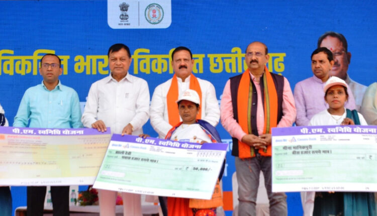 विकसित भारत विकसित छत्तीसगढ़ कार्यक्रम में मुख्य अतिथि कैबिनेट मंत्री श्री देवांगन ने इस मौके पर प्रधानमंत्री आवास योजना, उज्जवला गैस योजना, राशन कार्ड, मोटराइज्ड ट्राइसायकल के 5-5 हितग्राहियों, आयुष्मान भारत योजना के 9 हितग्राहियों को आयुष्मान कार्ड, पीएम स्वनिधि योजना के 3 हितग्राहियों, नोनी सशक्तिकरण सहायता योजना, मुख्यमंत्री निर्माण श्रमिक मृत्यु व दिव्यांग सहायता योजना, और मिनीमाता महतारी जतन 2-2 हितग्राहियों को लाभान्वित किया। उन्होंने पीएम विश्वकर्मा योजना के 9 हितग्राहियों को प्रशिक्षण प्रमाण पत्र वितरित किया।