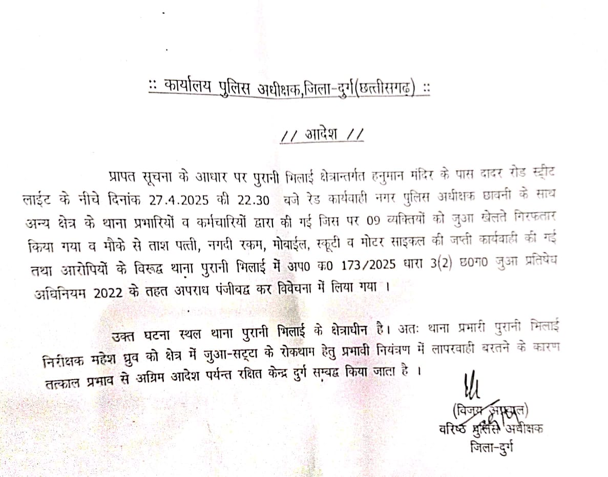 भिलाई 3 थाना प्रभारी को जुआ मामले में किया गया लाइन अटैच?