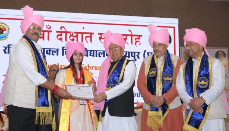 राज्यपाल एवं कुलाधिपति श्री विश्वभूषण हरिचंदन की अध्यक्षता में आज यहां पं. रविशंकर विश्वविद्यालय रायपुर का 27वां दीक्षांत समारोह सम्पन्न हुआ। समारोह में अति विशिष्ट अतिथि उच्च शिक्षा मंत्री श्री बृजमोहन अग्रवाल एवं मुख्य अतिथि प्रो.(डॉ.) बुद्ध रश्मि मणि उपस्थित थे। दीक्षांत समारोह में प्रख्यात कवि श्री माधव कौशिक को मानद उपाधि, 45 हजार से अधिक विद्यार्थियों को स्वर्ण पदक, स्नातक एवं स्नातकोत्तर पी एच डी की डिग्री प्रदान की गई।राज्यपाल ने डिग्री प्राप्त कर रहे विद्यार्थियों को शुभकामनाएं देते हुए कहा कि विद्यार्थियों को अपने ज्ञान का प्रयोग, समाज और राष्ट्र की भलाई के लिए करना चाहिए। राज्यपाल श्री हरिचंदन ने कहा कि विद्यार्थियों को शोध के क्षेत्र में ऐसे विषयों पर काम करना चाहिए जैसे सामाजिक न्याय, टिकाऊ विकास, जलवायु परिवर्तन और पर्यावरण आदि जो ज्वलंत मुद्दे हैं और जिन पर बहुत कुछ शोध किए जाने की आवश्यकता हैं, आज पूरा विश्व ऐसी चुनौतियों से जूझ रहा है। इसके अलावा विद्यार्थियों को सॉफ्ट स्किल्स और नैतिक मूल्यों पर भी बराबरी से ध्यान देना चाहिए। उन्होंने विद्यार्थियों का वंचित वर्ग के लोगों के लिए काम करने का आह्वान किया। उन्होंने कहा कि युवाओं को राष्ट्र की प्रगति के लिए आगे बढ़कर कार्य करना चाहिए और प्रधानमंत्री श्री नरेंद्र मोदी जी की संकल्पना विकसित भारत में सक्रिय होकर भाग लेना चाहिए। विद्यार्थियों में राष्ट्रीय भावना जागृत होनी चाहिए।