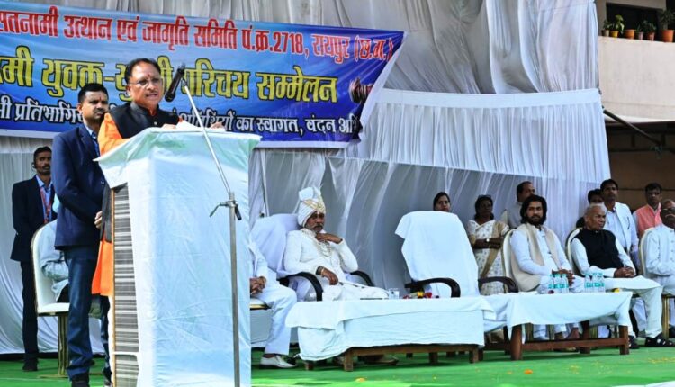 मुख्यमंत्री श्री विष्णु देव साय ने आज राजधानी रायपुर के कचहरी चौक स्थित खालसा स्कूल परिसर में सतनामी उत्थान एवं जागृति समिति द्वारा आयोजित सतनामी युवक-युवती परिचय सम्मेलन को संबोधित करते हुए कहा कि ऐसे आयोजन समाज के लिए लाभदायक होते हैं। समाज के गुरु बालदास साहब ने अपने पुत्र का विवाह, समाज द्वारा आयोजित परिचय सम्मेलन और आदर्श सामूहिक विवाह में कराकर समाज के सामने एक बड़ा उदाहरण प्रस्तुत किया है। ऐसे आयोजनों को प्रोत्साहित करने की आवश्यकता है।