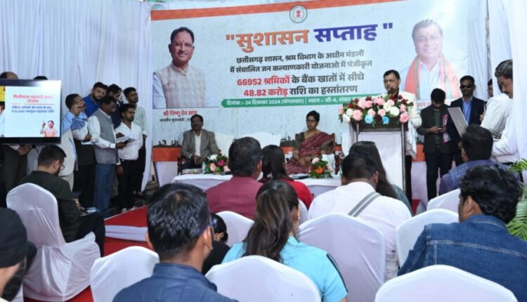 श्रम मंत्री श्री लखन लाल देवांगन आज सवेरे रायपुर के शंकर नगर स्थित अपने निवास कार्यालय में प्रदेश के 66 हज़ार 952 श्रमवीरों और उनके परिवारजनों के सीधे खाते में 48.82 करोड़ की राशि डीबीटी के जरिए ऑनलाईन अंतरित की। इस दौरान श्री देवांगन ने रायगढ़ जिले के तमनार में शहीद वीर नारायण सिंह अन्नपूर्णा अन्न योजना का वर्चुअल शुभारंभ किया। यह 27वां अन्नपूर्णा दाल-भात केंद्र है, जिसमें 5 रूपए में श्रमिकों को भरपेट गरम भोजन उपलब्ध कराया जाता है। प्रदेश के शेष 6 जिलों में भी यह योजना जल्द प्रारंभ की जा रही है।