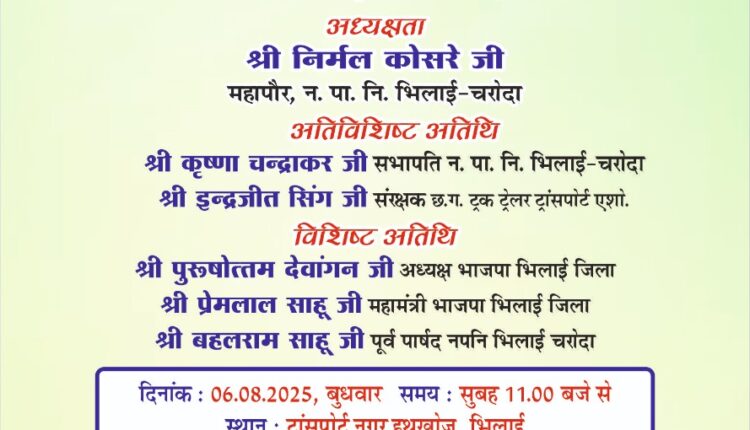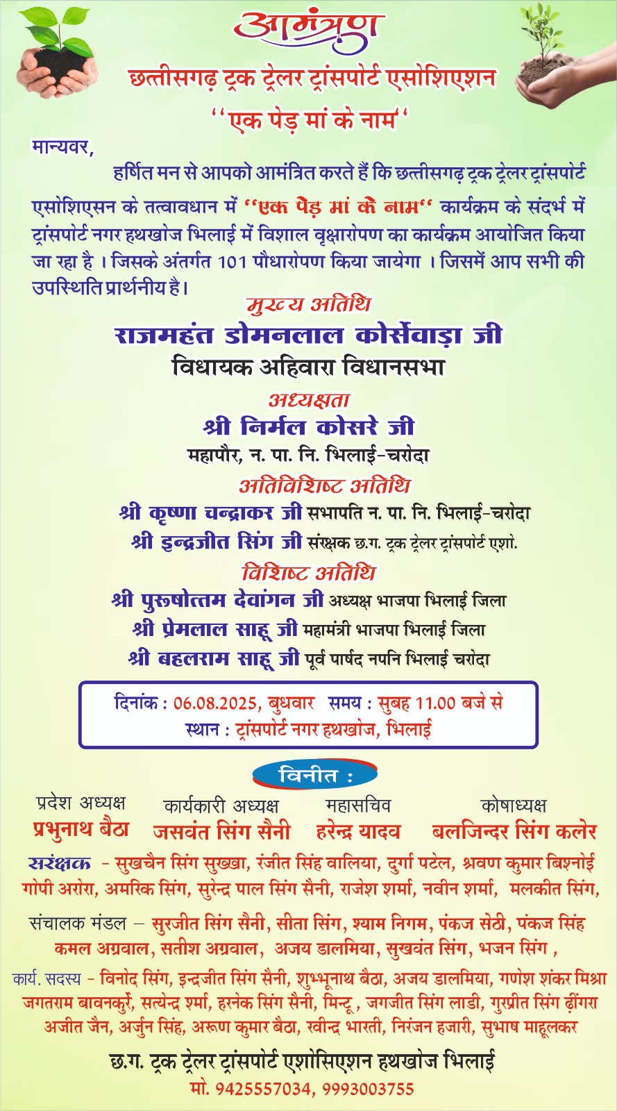 छत्तीसगढ़ ट्रक ट्रेलर टांसपोर्ट एसोसिएशन के प्रांतीय अध्यक्ष प्रभुनाथ बैठा ने जानकारी दी कि दिनांक 6 अगस्त को सुबह 11:00 बजे से एक पेड़ मां के नाम के तहत वृक्षारोपण का कार्यक्रम ट्रांसपोर्ट नगर हथखोज मेंआयोजित किया गया है जिसमें अहिवरा विधानसभा के सम्मानीय विधायक राजमहंत श्री डोमन लाल कोर्शेवाडा जी , महापौर निर्मल कौसरे जी ,सभापति कृष्ण चंद्राकर जी ,आयुक्त श्री अभिजीत पाथारे जी , एसोसिएशन के संरक्षक श्री इंदरजीत सिंह छोटू ,जिलाध्यक्ष भाजपा पुरुषोत्तम देवांगन जी जिला महामंत्री प्रेम लाल साहू जी , प्रांतीय अध्यक्ष प्रभुनाथ बैठा , छत्तीसगढ़ चैंबर ऑफ़ कॉमर्स के प्रदेश महासचिव अजय भसीन ,महासचिव हरेंद्र यादव कार्यकारी अध्यक्ष यशवंत सिंह सैनी, कोषाध्यक्ष बलजिंदर सिंह काले भाई , मलकीत सिंह पूर्व प्रदेश अध्यक्ष सुखचैन सिंह सुखा , गोपी अरोरा ,राजू भाई ,रंजीत सिंह वालिया , श्रवण कुमार विश्नोई , दुर्गा पटेल,,श्याम निगम , कमल अग्रवाल ,भजन सिंह ,शंभू नाथ बैठा, पंकज सिंह ,पंकज सेठी, संजय शर्मा , जी एस मिश्रा, अजय डालमिया अजीत जैन, अर्जुन सिंह ,राजू भाई ,सीता सिंह ,विक्रम सिंह इंदरजीत सिंह सैनी , सुरजीत सिंह सैनी, जगजीत सिंह सैनी, हरनेक सिंग सैनी ,जगत राम बावन कुरे,दुर्गा पटेल, मंदिर पुजारी अश्वनी कुमार मिश्रा ,निरंजन हजारी गुरप्रीत सिंह ढींगरा सुभाष महुलकर ,अरुण कुमार बैठा ,रविंद्र भारती प्रमुख रुप से उपस्थित रहेंगे