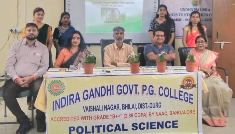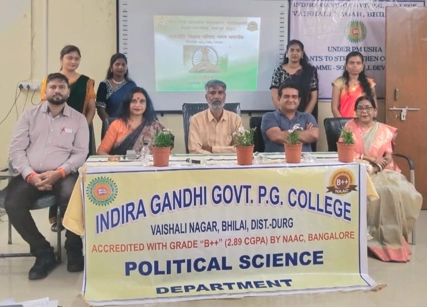 भिलाईनगर। महाविद्यालय के राजनीति विज्ञान विभाग द्वारा राजनीति विज्ञान परिषद का गठन किया गया, जिसमें स्नातकोत्तर प्रथम सेमेस्टर तथा तृतीय सेमेस्टर के छात्र–छात्राओं को सम्मिलित किया गया। कार्यक्रम की अध्यक्षता प्राचार्य डॉ अलका मेश्राम ने की तथा मुख्य अतिथि के रूप में वरिष्ठ पत्रकार एवं साहित्यकार शिवनाथ शुक्ल उपस्थित थे।कार्यक्रम का प्रारम्भ सरस्वती पूजा से हुआ तथा सरस्वती वंदना छात्रा कु. लाजो द्वारा की गई। तत्पश्चात प्राचार्य डॉ अलका मेश्राम का स्वागत डॉ किरण रामटेके, श्री शिवनाथ शुक्ल का स्वागत श्री अमृतेष शुक्ला तथा वरिष्ठ प्राध्यापक डॉ कैलाश शर्मा का स्वागत छात्र सागर रामटेके ने पौधा भेंटकर किया । विभागाध्यक्ष डॉ किरण रामटेके ने स्वागत भाषण में विभागीय गतिविधियों की जानकारी दी तथा राजनीति विज्ञान परिषद के सदस्यों के नामों की घोषणा की। अध्यक्ष कु. कुसुम साहू , उपाध्यक्ष सागर रामटेके, सचिव आरती निषाद तथा सहसचिव कु अर्चना तिवारी तथा कोषाध्यक्ष कु कोमल मेहरा को बनाया गया। तत्पश्चात प्राचार्य डॉ अलका मेश्राम ने छात्रों को अनुशासित रहते हुए जीवन में अपने लक्ष्यों को प्राप्त करने प्रोत्साहित किया। उन्होंने प्रेस स्वतंत्रता तथा संविधान के अनुच्छेद 19 पर भी विस्तार से प्रकाश डाला। मुख्य अतिथि श्री शिवनाथ शुक्ला ने इस अवसर पर ” राजनीति तथा पत्रकारिता” विषय पर छात्र छात्राओं का ज्ञानवर्धन किया । उन्होंने बताया कि कैसे पत्रकारिता लोकतंत्र का चौथा स्तंभ है। उन्होंने ईमानदार पत्रकारिता पर जोर दिया । वर्तमान समय में सोशल मीडिया से राजनीति पर होने वाले व्यापक प्रभाव पर भी उन्होंने चर्चा की। उन्होंने छात्रों का अनुशासित जीवन तथा उसमें नैतिक मूल्यों के महत्व पर भी मार्गदर्शन किया।कार्यक्रम का संचालन कु कुसुम साहू ने किया तथा धन्यवाद ज्ञापन कु अर्चना तिवारी ने दिया। इस कार्यक्रम में विभाग के सभी छात्र छात्राएं तथा कला संकाय के सभी प्राध्यापक डॉ संजय दास, श्रीमती सुशीला शर्मा, श्रीमती कौशल्या शास्त्री , डॉ चांदनी मरकाम आदि उपस्थित रहे।