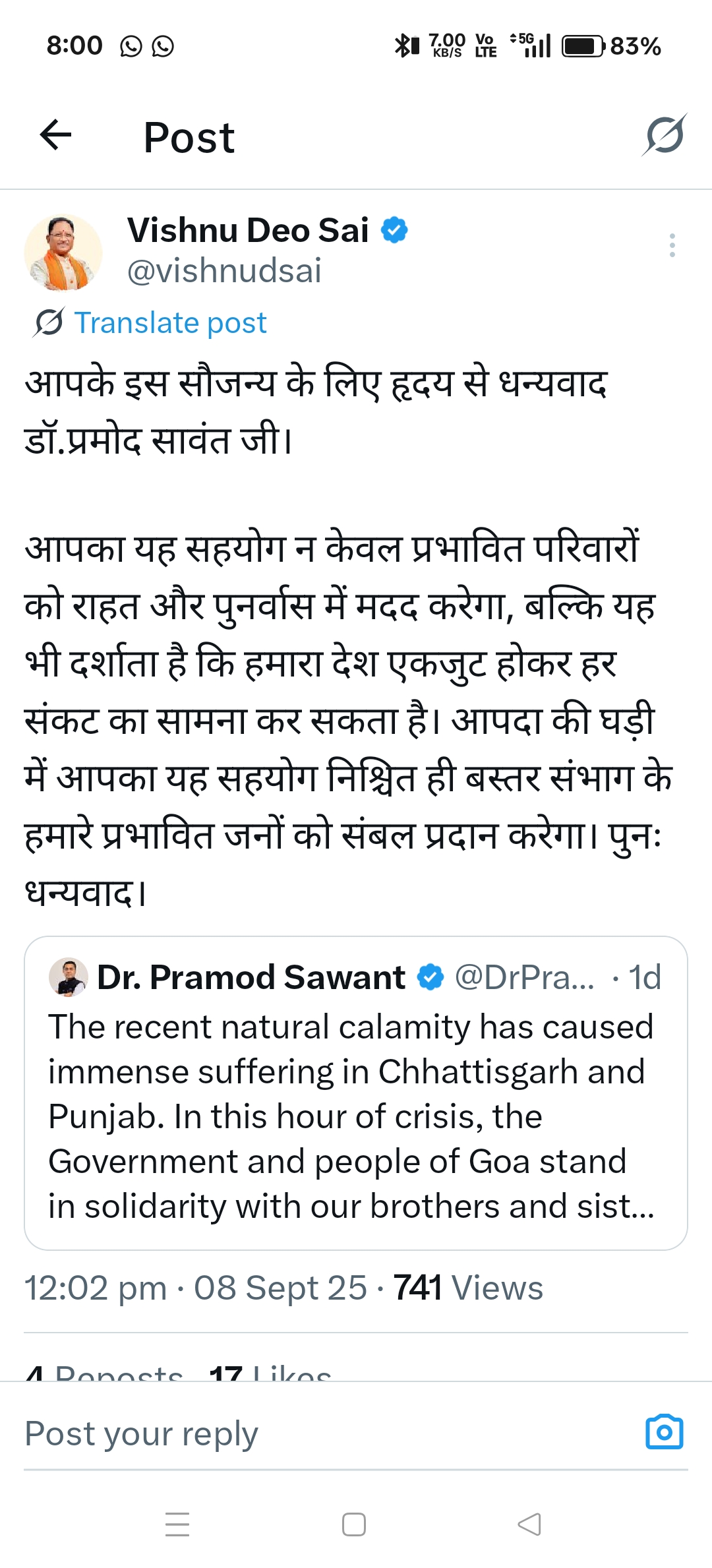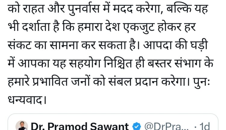 आपके इस सौजन्य के लिए हृदय से धन्यवाद डॉ.प्रमोद सावंत जी:–मुख्यमंत्री विष्णु देव साय