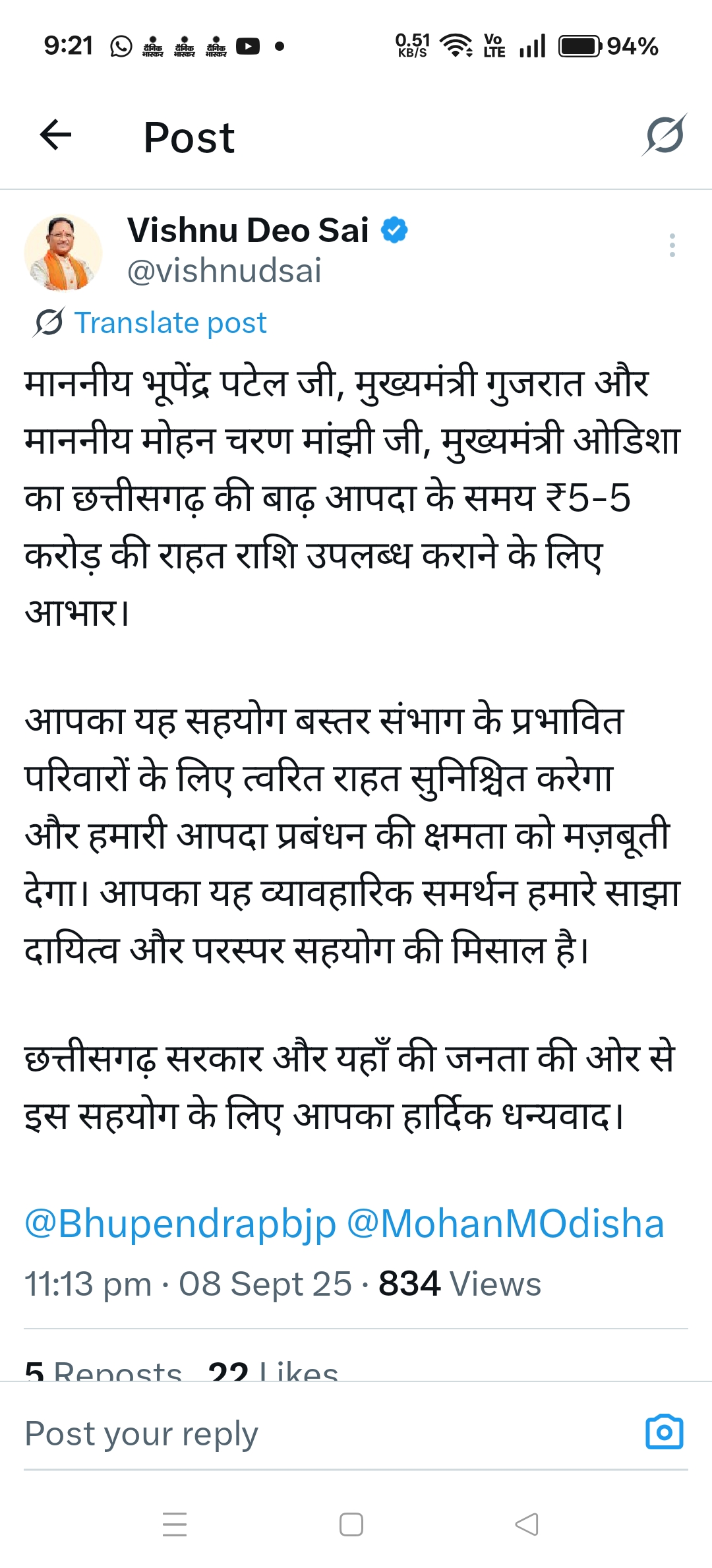 माननीय भूपेंद्र पटेल जी, मुख्यमंत्री गुजरात और माननीय मोहन चरण मांझी जी, मुख्यमंत्री ओडिशा का छत्तीसगढ़ की बाढ़ आपदा के समय ₹5-5 करोड़ की राहत राशि उपलब्ध कराने के लिए आभार।