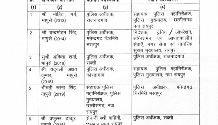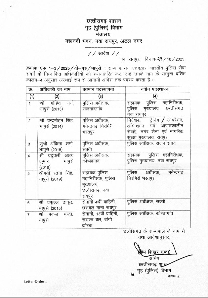 शासन ने राज्य पुलिस विभाग में बड़े पैमाने पर प्रशासनिक फेरबदल (IPS Transfer) किया है। जारी आदेश के अनुसार भारतीय पुलिस सेवा के अधिकारियों को नई जिम्मेदारियाँ सौंपी गई हैं।• मोहित गर्ग (भापुसे 2013) – पुलिस अधीक्षक, राजनांदगांव से सहायक पुलिस महानिरीक्षक, पुलिस मुख्यालय, नवा रायपुर नियुक्त।• चन्द्रमोहन सिंह (भापुसे 2014) – पुलिस अधीक्षक, मनेन्द्रगढ़-चिरमिरी-भरतपुर से निदेशक, ट्रेनिंग/ऑपरेशन, अग्निशमन एवं आपातकालीन सेवाएँ, नगर सेना एवं नागरिक सुरक्षा मुख्यालय, रायपुर।• अंकिता शर्मा (भापुसे 2018) – पुलिस अधीक्षक, सक्ती से पुलिस अधीक्षक, राजनांदगांव।• यदुवली अक्षय कुमार (भासे 2018) – पुलिस अधीक्षक, कोण्डागांव से सहायक पुलिस महानिरीक्षक, पुलिस मुख्यालय, नवा रायपुर।• रतना सिंह (भापुसे 2019) – सहायक पुलिस महानिरीक्षक, पुलिस मुख्यालय, नवा रायपुर से पुलिस अधीक्षक, मनेन्द्रगढ़-चिरमिरी-भरतपुर।• प्रफुल्ल ठाकुर (भापुसे 2015) – सेनानी, 4वीं वाहिनी, छसबल माना रायपुर से पुलिस अधीक्षक, सक्ती।• पंकज चन्द्रा (भापुसे) – सेनानी, 13वीं वाहिनी, सशस्त्र बल, बांगो कोरबा से पुलिस अधीक्षक, कोण्डागांव।इन तबादलों के बाद कई जिलों में नई जिम्मेदारी संभालने के साथ पुलिस प्रशासनिक ढाँचे में नई ऊर्जा और कार्यसंस्कृति आने की उम्मीद की जा रही है।