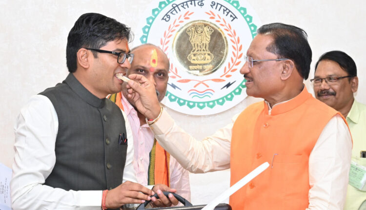 मुख्यमंत्री श्री विष्णु देव साय ने आज विधानसभा परिसर स्थित अपने कक्ष में छत्तीसगढ़ के अमृत काल के नींव का बजट पेश करने पर वित्त मंत्री श्री ओपी चौधरी को मिठाई खिलाकर बधाई दी। वित्त मंत्री श्री चौधरी ने भी मुख्यमंत्री श्री विष्णु देव साय को मुंह मीठा कराकर धन्यवाद दिया।