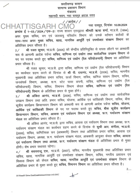 छत्तीसगढ़ में बड़े पैमाने पर आईएएस अफसरों का तबादला किया गया है. सामान्य प्रशासन विभाग की ओर से जारी आदेश के मुताबिक, आईएएस ऋचा शर्मा को वर्तमान कर्तव्यों के साथ नागरिक आपूर्ति एवं उपभोक्ता संरक्षण विभाग के अपर मुख्य सचिव का अतिरिक्त प्रभार दिया गया है।