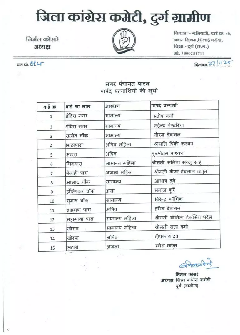 नगरीय निकाय चुनाव: कांग्रेस ने पाटन दुर्ग जिले के पार्षद प्रत्याशियों की सूची जारी की
