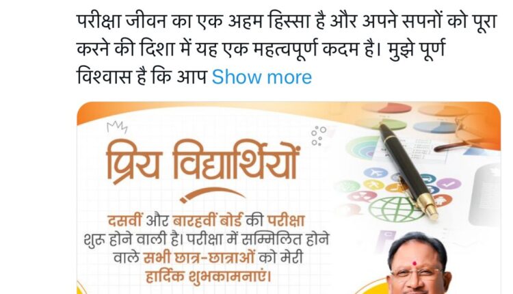 सोशल मीडिया पर सीएम साय ने कहा, “प्रिय विद्यार्थियों, दसवीं और बारहवीं बोर्ड की परीक्षा शुरू होने वाली है। परीक्षा में सम्मिलित होने वाले सभी छात्र-छात्राओं को मेरी हार्दिक शुभकामनाएं।”