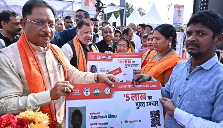 विकसित भारत संकल्प यात्रा के शुभारंभ के अवसर पर राजधानी रायपुर के स्वामी विवेकानंद सरोवर उद्यान में विभिन्न विभागों द्वारा स्टॉल लगाए गए। इसका मुख्यमंत्री श्री विष्णु देव साय ने अवलोकन किया। मुख्यमंत्री श्री साय ने दो हितग्राही श्री दीपक वाधवानी को प्रधानमंत्री मुद्रा योजना के तहत 8 लाख रूपए और शबनूर बानो को पीएम स्वनिधि योजना के तहत 20 हजार रूपए का चेक प्रदान किया। स्वास्थ्य विभाग द्वारा 176 हितग्राहियों के आयुष्मान कार्ड का पंजीयन किया गया। साथ ही मुख्यमंत्री ने आयुष्मान कार्ड का वितरण भी किया।