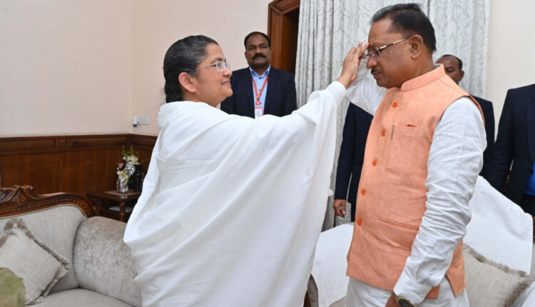 मुख्यमंत्री श्री विष्णु देव साय से आज राज्य अतिथि गृह पहुंना में प्रजापिता ब्रह्माकुमारी ईश्वरीय विश्वविद्यालय की ब्रह्माकुमारी सविता बहन और सोमनाथ भाई सहित अन्य बहनों ने सौजन्य मुलाकात की। ब्रह्माकुमारी सविता ने मुख्यमंत्री का तिलक कर मुंह मीठा कराकर बधाई और शुभकामना दी। उन्होंने मुख्यमंत्री श्री साव और विधानसभा के सभी सदस्यों को राजस्थान के माउंट आबू स्थित संस्था के अंतरराष्ट्रीय मुख्यालय में आमंत्रित किया। मुख्यमंत्री को उन्होंने प्रजापिता ब्रह्माकुमारी ईश्वरीय विश्वविद्यालय के गतिविधियों की भी जानकारी दी।