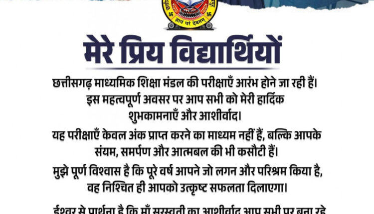 रायपुर: उपमुख्यमंत्री श्री विजय शर्मा ने छत्तीसगढ़ माध्यमिक शिक्षा मंडल की आगामी बोर्ड परीक्षाओं के पूर्व विद्यार्थियों को शुभकामनाएँ दी हैं। उन्होंने अपने एक्स अकाउंट पर विद्यार्थियों को दिए शुभकामना संदेश में सभी परीक्षार्थियों को संबोधित करते हुए कहा कि प्रिय विद्यार्थियों छत्तीसगढ़ माध्यमिक शिक्षा मंडल की परीक्षाएँ आरंभ होने जा रही हैं। इस महत्वपूर्ण अवसर पर आप सभी को मेरी हार्दिक शुभकामनाएँ और आशीर्वाद। यह परीक्षाएँ केवल अंकउ प्राप्त करने का माध्यम नहीं हैं, बल्कि आपके संयम, समर्पण और आत्मबल की भी कसौटी हैं।