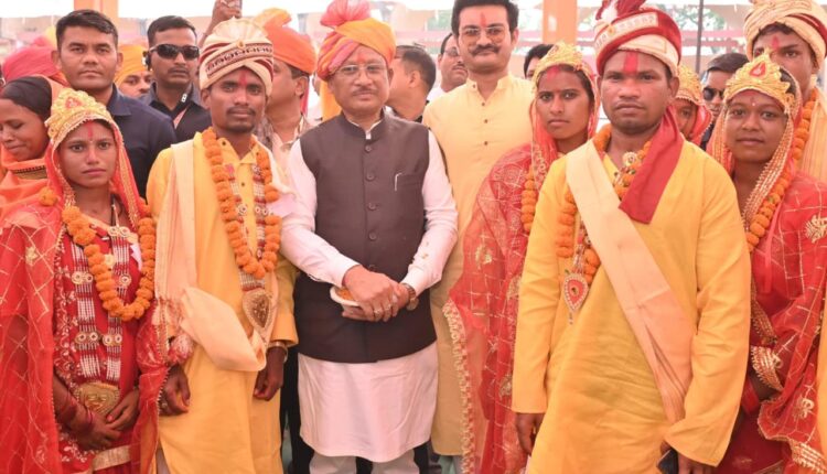 रायपुर: मुख्यमंत्री श्री विष्णुदेव साय आज जशपुर के रणजीता स्टेडियम में मुख्यमंत्री कन्या विवाह योजना के अंतर्गत आयोजित सामूहिक विवाह समारोह में शामिल हुए, जहां 240 नवविवाहित जोड़ों का विवाह विधिवत सम्पन्न हुआ। मुख्यमंत्री श्री साय विवाह मंडप में पहुंचकर नवदंपतियों के बीच गए और उन्हें शुभाशीष प्रदान करते हुए उनके सुखद, समृद्ध एवं मंगलमय दांपत्य जीवन की कामना की। कार्यक्रम का वातावरण पारंपरिक रीति-रिवाजों, वैदिक मंत्रोच्चार और सामाजिक एकता के भाव से ओतप्रोत रहा।